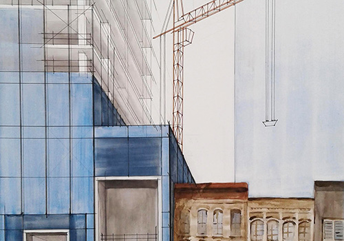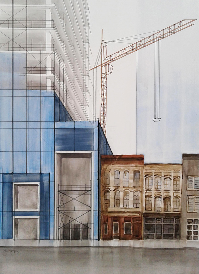 The work you see here is a revitalization of the drawings architects would have produced when they had as tools only pencils, pens and brushes. Most of the work intentionally retains evidence of its construction; lines in pencil or light marker that convey the story not only of the subject and its structure, but of the work itself.